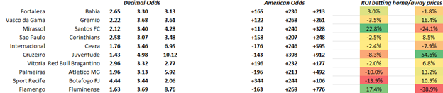 Santos have Neymar now and I’ve probably not got enough weight on it. I have been high on Mirassol so I’m not ruling out them shortening a bit. Juventude could be a good handicap bet, both could be due a bit of regression vs. current opinion. Flamengo I think they will have a stronger lineup than I’ve used for these prices so I’m not too confident there. Sport Recife have some nice new players that probably aren’t getting quite enough weight.