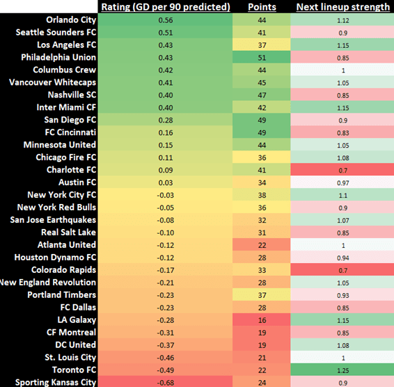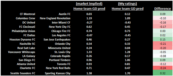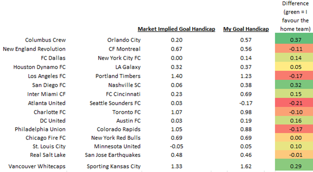The orange and red on the right means I’m a bit low on my total goal counts across the board. The MLS HAS dropped from 3.15 average goals per game last season to 2.93 which probably explains this however it surprises me how total goal expectations seemingly require more regression than individual team ratings.