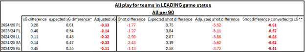 If we saw that 1 goal/2 goal games were lower scoring overall, it could imply the leading team was shutting down the game efficiently to preserve their lead. This could help convert a lead into a win and hence isn’t really ‘lower performance’ even if the goal difference per 90 was lower.