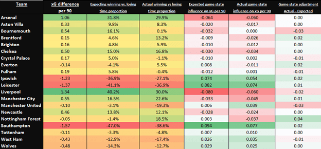 The blanket approximation that all teams underperform by 0.2 xG per 90 and overperformed by 0.2 xG per 90 while trailing may not hold. There could be several reasons for this such as individual teams employing different styles in different game states or added nuance that I am yet to consider such as better teams not experiencing weaker performance while they lead.