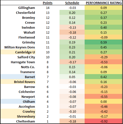 Port Vale don’t have many points, but I rate their performances as 3rd so far! My ratings include a 20% weight on goals for/against – their performance levels would comfortably gap 3rd place if credit for goals were removed (which may not be an unreasonable thing to do for 6 games).